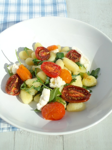 Verdeel wat gnochhi op het bord en meng dit met de rucola. Voeg de gedroogde tomaten toe.